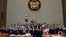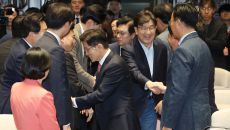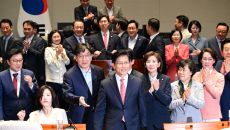 아시아투데이 이병화 기자 = 김문수 국민의힘 대통령 후보와 권성동 원내대표를 비롯한 의원들이 11일 국회에서 열린 의원총회에서- 2025.05.11 15:58