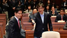 아시아투데이 이병화 기자 = 김문수 국민의힘 대통령 후보와 권성동 원내대표가 11일 국회에서 열린 의원총회를 마친 뒤 함께 이- 2025.05.11 15:58