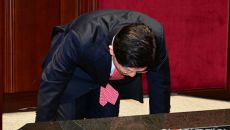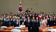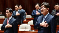 아시아투데이 이병화 기자 = 김문수 국민의힘 대통령 후보와 권성동 원내대표가 11일 국회에서 열린 의원총회에서 국민의례를 하고- 2025.05.11 15:57