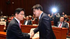아시아투데이 이병화 기자 = 김문수 국민의힘 대통령 후보와 권성동 원내대표가 11일 국회에서 열린 의원총회에서 악수를 나누고- 2025.05.11 15:57