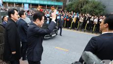 (부산=뉴스1) 이재명 기자 = 이재명 대통령이 23일 부산 동구 해양수산부 청사에서 열린 개청식에 참석하며 시민들에게 인사하- 2025.12.23 15:06