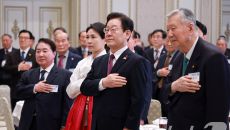 (서울=뉴스1) 허경 기자 = 이재명 대통령과 김혜경 여사가 22일 청와대 영빈관에서 열린 대한노인회 초청 오찬에서 국민의례를- 2025.12.22 13:23