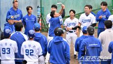20일 일본 오키나와 온나손 아카마 구장에서 열린 대한민국 야구 대표팀과 삼성 라이온즈의 평가전, 4대3 승리한 삼성 선수들이- 2분전