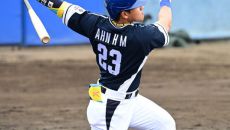 [사진]안현민, '연습경기 첫 타석 솔로포 미소'