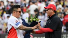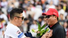 [포토] 최형우-이범호 감독 '꽃범호에게 꽃다발'