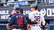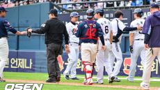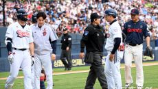 27일 잠실야구장에서 열린 롯데와 두산의 경기, 6회말 2사 1루 두산 김재환이 롯데 김상수의 투구에 맞은 뒤 화를 내자 김상- 2025-04-27 16:30