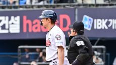 27일 잠실야구장에서 열린 롯데와 두산의 경기, 6회말 2사 1루 두산 김재환이 롯데 김상수의 투구에 맞은 뒤 1루로 걸어나가- 2025-04-27 16:28