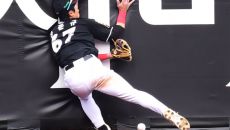 [포토] 유준규 '펜스 충돌하며 부상 교체'