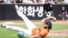 [포토] 한화 선발 폰세 '1회 투구 도중 콰당'