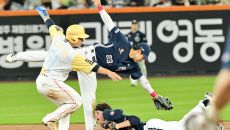 [사진]잭로그,'문현빈의 강습타구에 발목 고통'