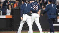 14일 대전 한화생명볼파크에서 열린 두산-한화전. 4회말 무사 문현빈의 강습타구에 맞은 잭로그가 교체되고 있다. 대전=정재근- 2025-05-14 19:47