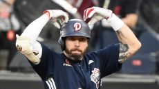 14일 대전 한화생명볼파크에서 열린 두산-한화전. 1회초 무사 1루 케이브가 안타를 친 후 세리머니를 하고 있다. 대전=정재근- 2025-05-14 19:02