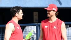 20일 잠실야구장에서 열린 SSG와 두산의 경기, SSG 맥브룸과 앤더슨이 이야기를 나누고 있다. 잠실=허상욱 기자wook@s- 2025-05-20 16:14