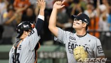 20일 울산 문수야구장에서 열린 NC 다이노스와 한화 이글스의 경기. 한화 마무리 김서현을 승리 후 기뻐하고 있다. 울산=박재- 2025-05-20 21:29