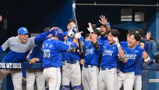 20일 서울 고척스카이돔에서 열린 삼성-키움전. 9회초 1사 김영웅이 역전 솔로포를 친 후 환영받고 있다. 고척=정재근 기자- 2025-05-20 21:00