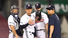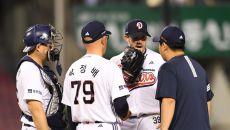 [포토]잭로그의 의지를 이승엽 감독에게 전하는 박정배 코치
