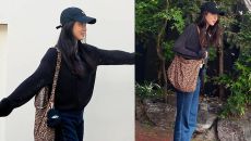 정려원, 가방에 힘 좀 준 멋잘알! 니트에 데님 청순하게 어울린 봄 외출룩
