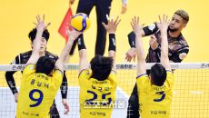 OK 레오가 6일 의정부체육관에서 열린 2023 도드람 V리그 남자부 KB손해보험과 OK금융그룹과의 경기에서 KB 삼중블로킹을- 2023-12-06 19:50