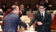 한동훈 법무부 장관(오른쪽)이 6일 서울 여의도 국회 예산결산특별위원회 회의장에서 열린 국민의힘 정책의원총회에서 윤재옥 원내대- 2023-12-06 18:28