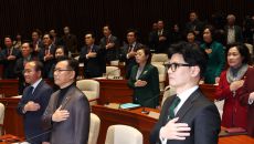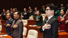 (서울=뉴스1) 송원영 기자 = 한동훈 법무장관이 6일 서울 여의도 국회에서 열린 국민의힘 정책의원총회에서 국기에 경례를 하고- 2023-12-06 15:18