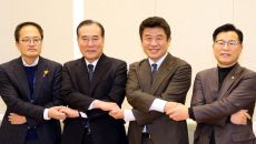 여야 정책위의장과 원내수석부대표가 참여하는 2+2 협의체 첫 회의가 열린 6일 서울 여의도 국회에서 만나 회의전 포즈를 취하고- 2023-12-06 15:09