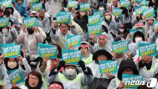 (서울=뉴스1) 김진환 기자 = 전국보건의료산업노동조합 조합원들이 6일 오후 서울 영등포구 여의도 국회 앞에서 열린 결의대회에- 2023-12-06 15:06