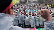 (서울=뉴스1) 김진환 기자 = 전국보건의료산업노동조합 조합원들이 6일 오후 서울 영등포구 여의도 국회 앞에서 열린 결의대회에- 2023-12-06 15:06