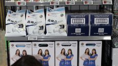 (서울=뉴스1) 박세연 기자 = 6일 서울 송파구 롯데마트 월드타워점에서 직원이 요소수를 진열하고 있다. 중국 통관이 한국에- 2023-12-06 12:57
