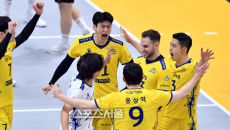 KB 비예나가 6일 의정부체육관에서 열린 2023 도드람 V리그 남자부 KB손해보험과 OK금융그룹과의 경기에서 득점한 후 동료- 2023-12-06 20:30