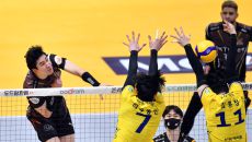 KB 비예나가 6일 의정부체육관에서 열린 2023 도드람 V리그 남자부 KB손해보험과 OK금융그룹과의 경기에서 OK 삼중블로킹- 2023-12-06 20:30