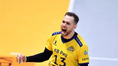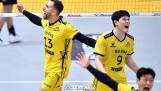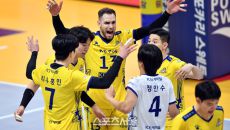 KB 비예나가 6일 의정부체육관에서 열린 2023 도드람 V리그 남자부 KB손해보험과 OK금융그룹과의 경기에서 득점한 후 동료- 2023-12-06 20:29