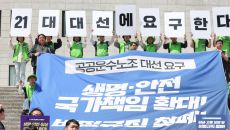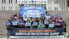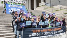 (서울=뉴스1) 허경 기자 = 민주노총 공공운수노조원들이 24일 서울 종로구 세종문화회관 계단에서 열린 대선 요구안 발표 기자- 2025-04-24 12:55