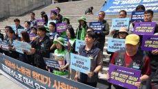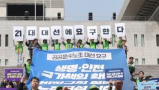 [서울=뉴스핌] 김학선 기자 = 민주노총 공공운수노조가 24일 서울 광화문 세종문화회관 계단에서 "공공성-노동권 확대가 사회대- 2025-04-24 12:06