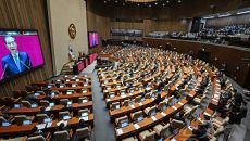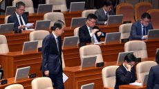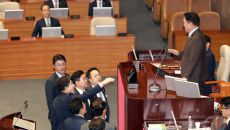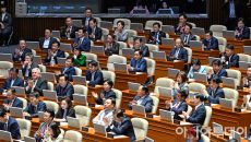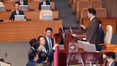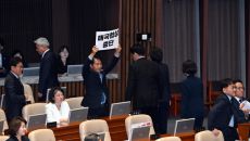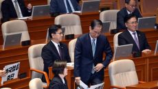 아시아투데이 송의주 기자 = 24일 국회에서 열린 본회의에서 국민의힘 의원들이 한덕수 대통령 권한대행 국무총리의 2025년도- 2025-04-24 11:44