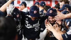 24일 서울 고척스카이돔에서 열린 두산-키움전. 7회초 1사 1, 2루 김재환이 스리런포를 친 후 양석환, 케이브와 함께 축하- 2025-04-24 20:39