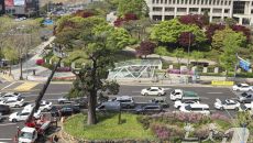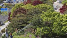 (서울=뉴스1) 김성진 기자 = 서초구 관계자들이 24일 서울 서초역사거리 중앙 녹지대에서 아시아 태평양 사법정의 허브 상징- 2025-04-24 11:15