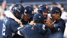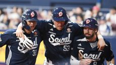 [포토] 김재환 스리런포, 어깨동무한 타자들 반기는 이승엽 감독