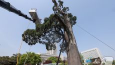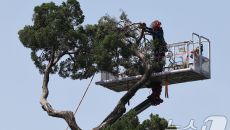 (서울=뉴스1) 김성진 기자 = 서초구 관계자들이 24일 서울 서초역사거리 중앙 녹지대에서 아·태 사법정의 허브 상징 '천년향- 2025-04-24 11:05