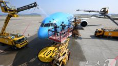 "새 도장 기체 멋지네"…대한항공, 봄맞이 항공기 동체 세척