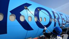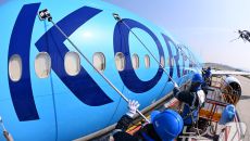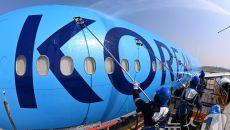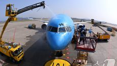 (인천공항=뉴스1) 장수영 기자 = 24일 오전 인천 중구 인천국제공항 대한항공 격납고에서 직원들이 봄을 맞아 항공기 동체를- 2025-04-24 11:04