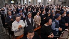 (서울=뉴스1) 사진공동취재단 = 24일 오전 서울 중구 명동대성당에서 거행된 프란치스코 교황 추모 미사에서 참석자들이 기도를- 2025-04-24 10:51
