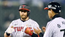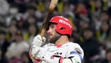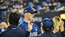 두산 선발투수 콜어빈이 24일 서울 고척스카이돔에서 열린 2025 KBO리그 키움과 경기 6회 투구 후 잭로그와 이야기를 나누- 2025-04-24 20:25
