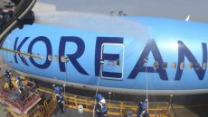 24일 인천 중구 대한항공 항공기 정비고에서 대한항공 관계자들이 새로운 CI가 적용된 항공기 동체를 세척하고 있다. <ⓒ투자가- 2025-04-24 10:19