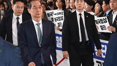 야당 피켓시위 속 국회 들어서는 한덕수 권한대행