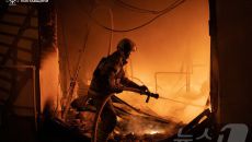 [포토] 러 드론 공격 받은 건물 불 끄는 우크라 소방대원