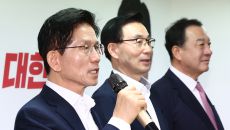 (서울=뉴스1) 김민지 기자 = 김문수 국민의힘 대선 경선 후보가 24일 오전 서울 여의도 국회 선거사무소에서 윤상현, 박수영- 2025-04-24 09:30