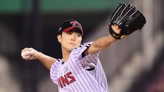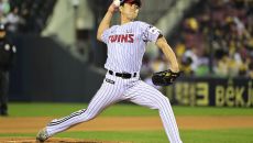 24일 잠실야구장에서 열린 NC와 LG의 경기, 6회초 LG 백승현이 NC 박민우의 강습타구를 몸으로 막아낸 후 고통스러워 하- 2025-04-24 20:10