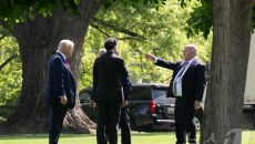 [포토] 100피트 성조기 깃대 설치 장소 찾는 트럼프와 직원