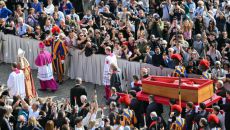 수많은 조문객이 운집한 가운데 스위스 근위대가 23일 프란치스코 교황의 관을 그가 거주했던 산타 마르타의 집에서 장례식이 열릴- 2025-04-24 04:30