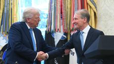 도널드 트럼프 미국 대통령(왼쪽)이 22일(현지시간) 백악관 집무실에서 폴 앳킨스 미 증권거래위원회(SEC) 위원장의 취임 행- 2025-04-24 00:38